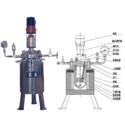 型反應釜采用端面稀土耦合驅動器,具有靜密封、無泄漏的特點。釜體材料主要采用1Cr18Ni9Ti 不銹鋼,并可根據不同介質要求制作316L不銹鋼、鈦材(TA2)、鎳材、鉭材、鋯材、哈氏合金、內襯聚四氟乙烯等特殊材質。攪拌軸承采用耐腐蝕不銹鋼軸承,適合高轉速、加氫催化,低粘度物料的攪拌,攪拌槳采用推進式攪拌漿。加熱方式一般為干式電加熱,也可根據用戶要求制作電加熱導熱油加熱或夾套加熱。帶有多功能控溫、控壓數顯控制箱。加熱控制系統采用PID自動溫度控制儀表,溫度控制十分準確。 儀表經整定后,可有效減輕溫度過沖。出料方式有上出料和下出料兩種,供用戶訂貨時選用。該系列產品具有運轉平穩、噪音小、操作方便等特點,是用戶進行各種化學反應試驗的理想裝置。